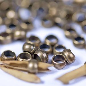 7. Соединим ланку с цепью. Для этого нам понадобятся зажимные бусины. Наденем на ланку 2 зажимные бусины.