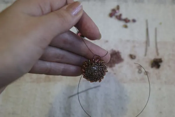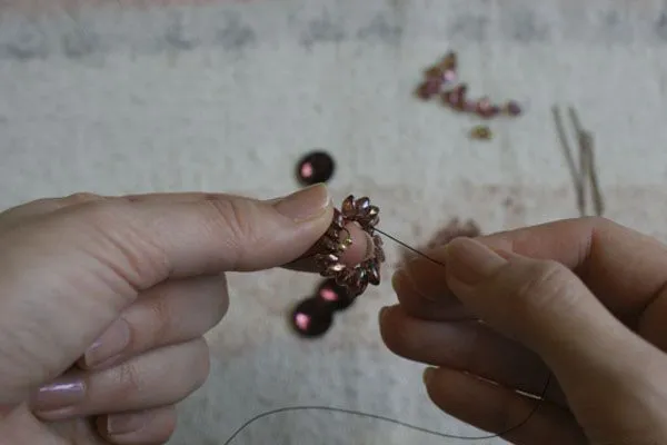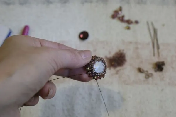 17. Оплетение закончили. Рабочую нить мы продеваем от середины плетения к краю нашего кабошону, к месту начала плетения в первом ряду.