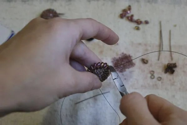 12. Поэтому количество бисеринок в ряду нужно будет уменьшить, пока плетение полностью не закроет внутреннюю сторону кабошона.