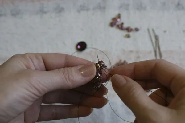18. Нанизываем 6 бисеринок и леску протягиваем на лицевую сторону кабошона,, отступив 2-3 бисеринки леску возвращаем на тыльную сторону плетения поближе к свободному краю лески.