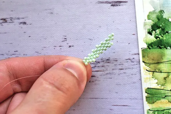 13. Берем лист, на каждый конец лески нанизываем по 1 светло-зеленой бисеринке.
