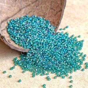 11. Далее оплетать наш камень мы будем методом мозаики. Нить выходит из бисерины первого ряда. Набираем бусинку и вставляем иголку, пропуская одну бусинку нашего первого ряда