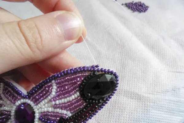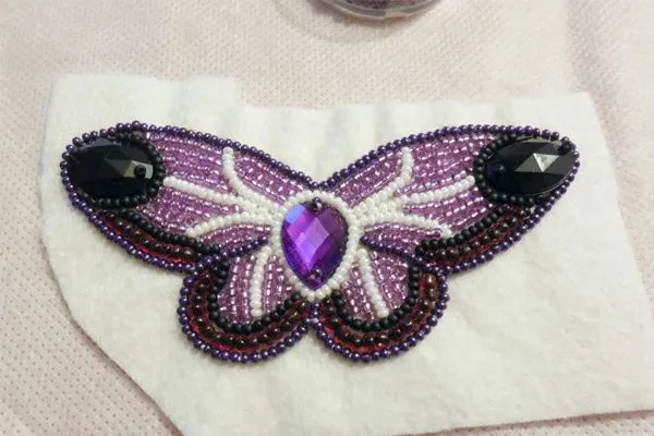 15. Пришиваем бабочку к спинке. Начинаем обрабатывать края вышивки бисером.