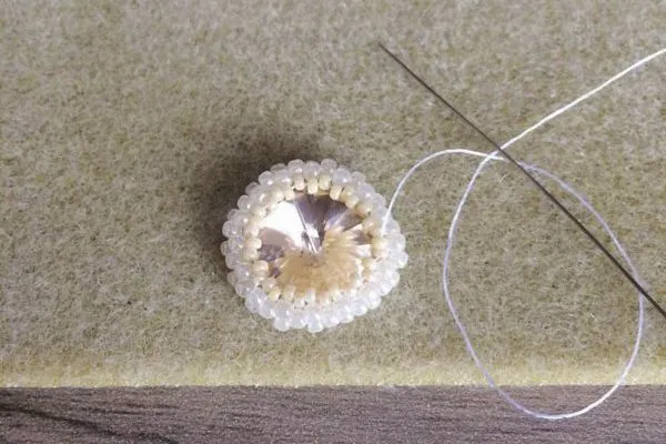 7. Теперь выводим нить на другую сторону, к лицу нашей ривольки. Проходим ряд бисером 15/0.