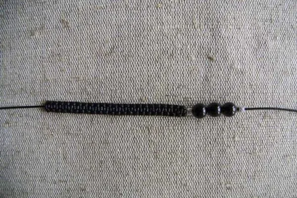 4. От бусины с орнаментом плетем цепочку из квадратных узлов длиной 7 см (для браслета общей длиной 19 см) (См. схему плетения квадратного узла). Обрезаем излишки нитей и подпаливаем концы.