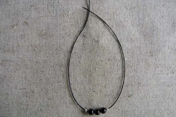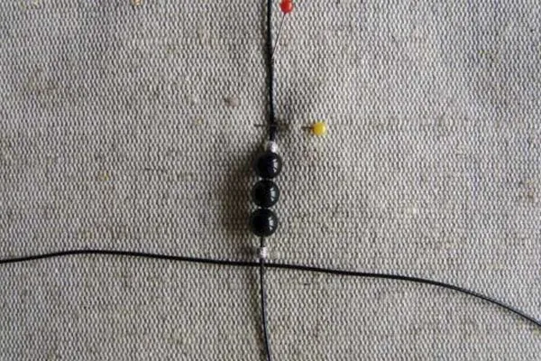 3. Берем основу браслета – нить 40 см, надеваем на нее 3 бусины из агата по центру и 2 металлические бусины с орнаментом по бокам. Помещаем все бусины на середину нити.