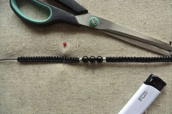 13. Оформляем концы браслета: надеваем металлические бусины-шарики, обрезаем излишки нитей, оставив 5-6 см, подпаливаем концы.