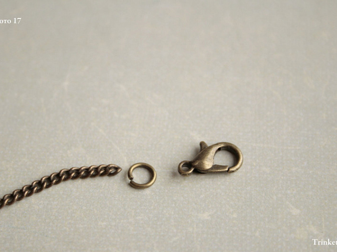 15. Соединим цепь с размером звена 4х6мм с цепью 1х1 мм с помощью соединительного колечка. То же самое сделаем с другой стороны.